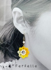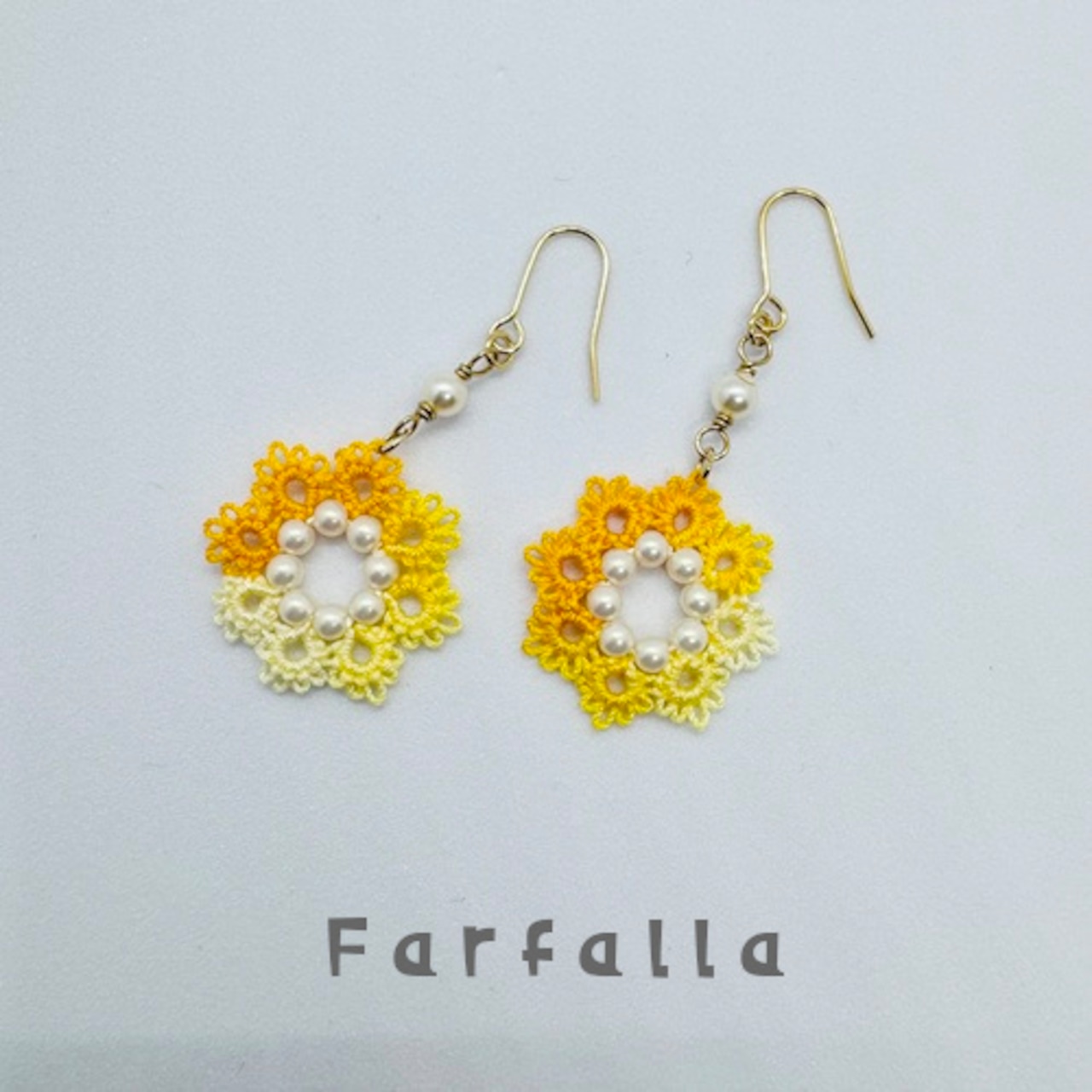 たんぽぽのようなグラデーションのレース糸が魅力的な繊細なタティングレースにガラスパール(一部)をあわせたピアスです